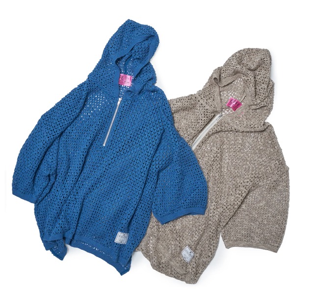 小花柄に編まれたハーフジップニットフーディー。 不規則な太さのスラブヤーンを使用し、自然な凹凸や明暗などがあり、 柔らかい表情が特徴です。 全体的に透け感があり、インナーカラーとともに楽しめる1枚。 ゆとりのある身幅で着丈は短めになっています。 model : men's 178cm Delft Blue Cyan Free size / ladies 160cm Vanilla Walnut Free size LOOK men's 178cm Vanilla Walnut Free size / ladies 161cm Delift Blue Cyan Free size ⚫︎カラー Vanilla Walnut / Delft Blue Cyan ⚫︎素材 Cotton75% Acryl25% ⚫︎サイズ Free Size : 着丈(前)58cm (後)63cm 身幅70cm 袖丈25cm