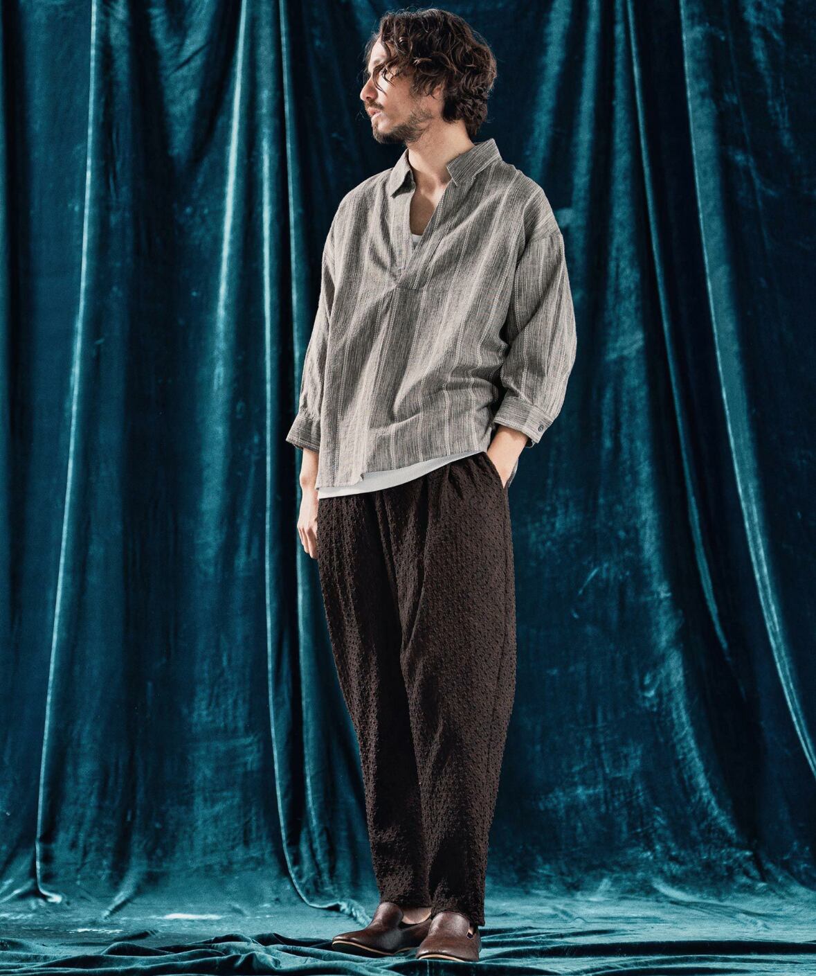 総柄のシアサッカーファブリックを使用したバルーンシルエットのパンツ。