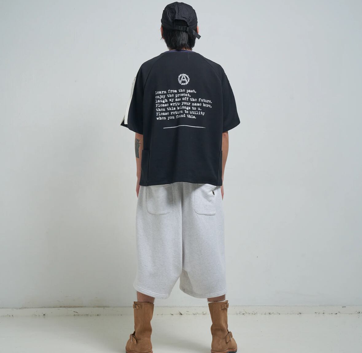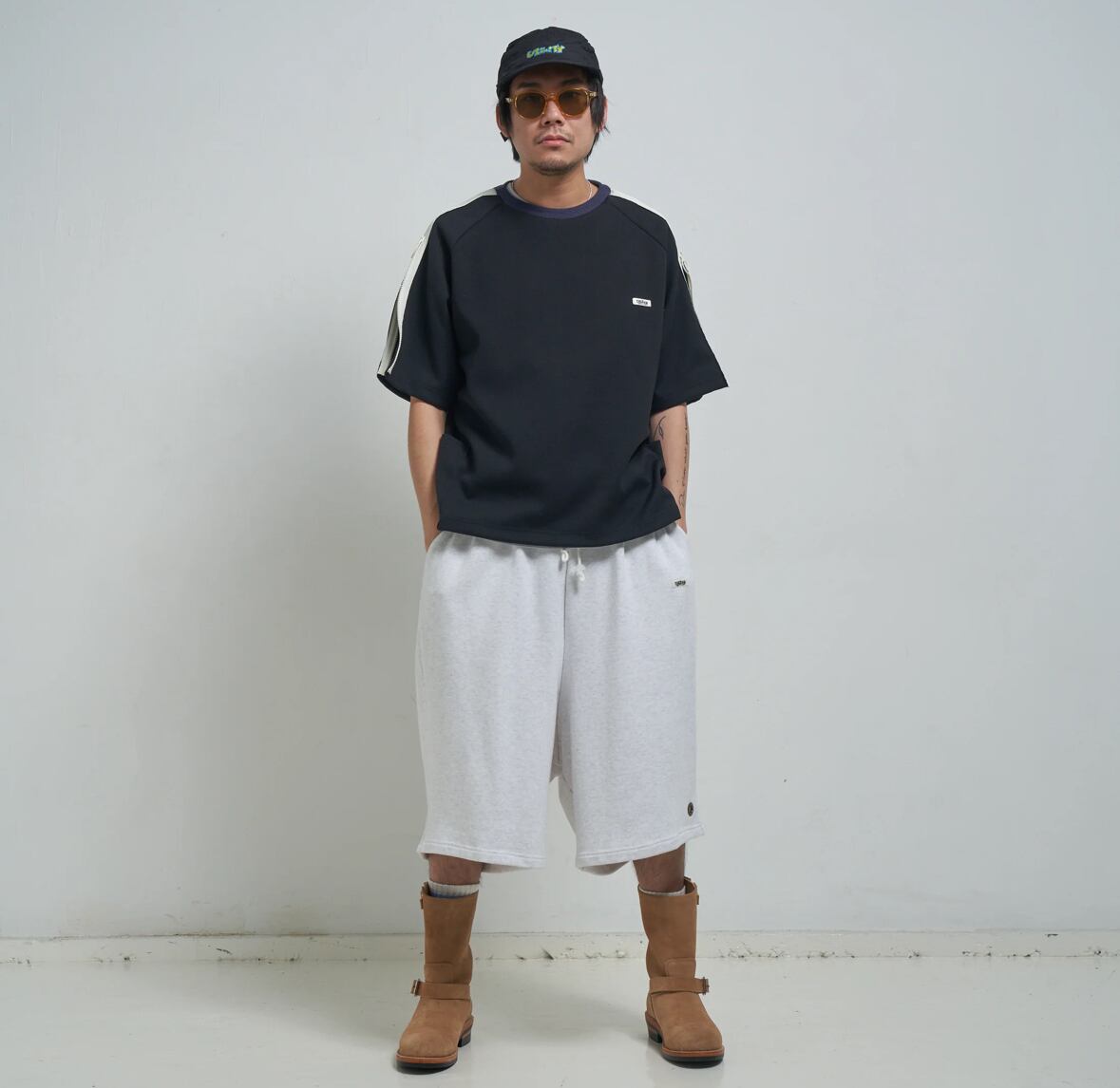 膝下丈に設定したスウェットワイドショーツ。